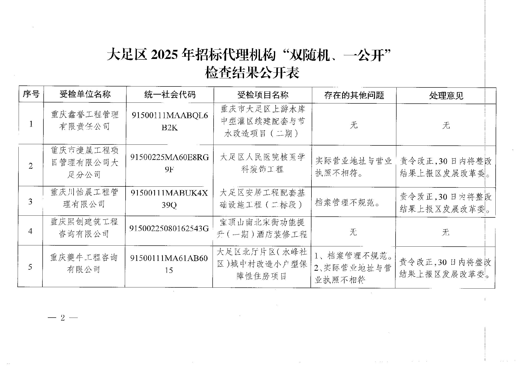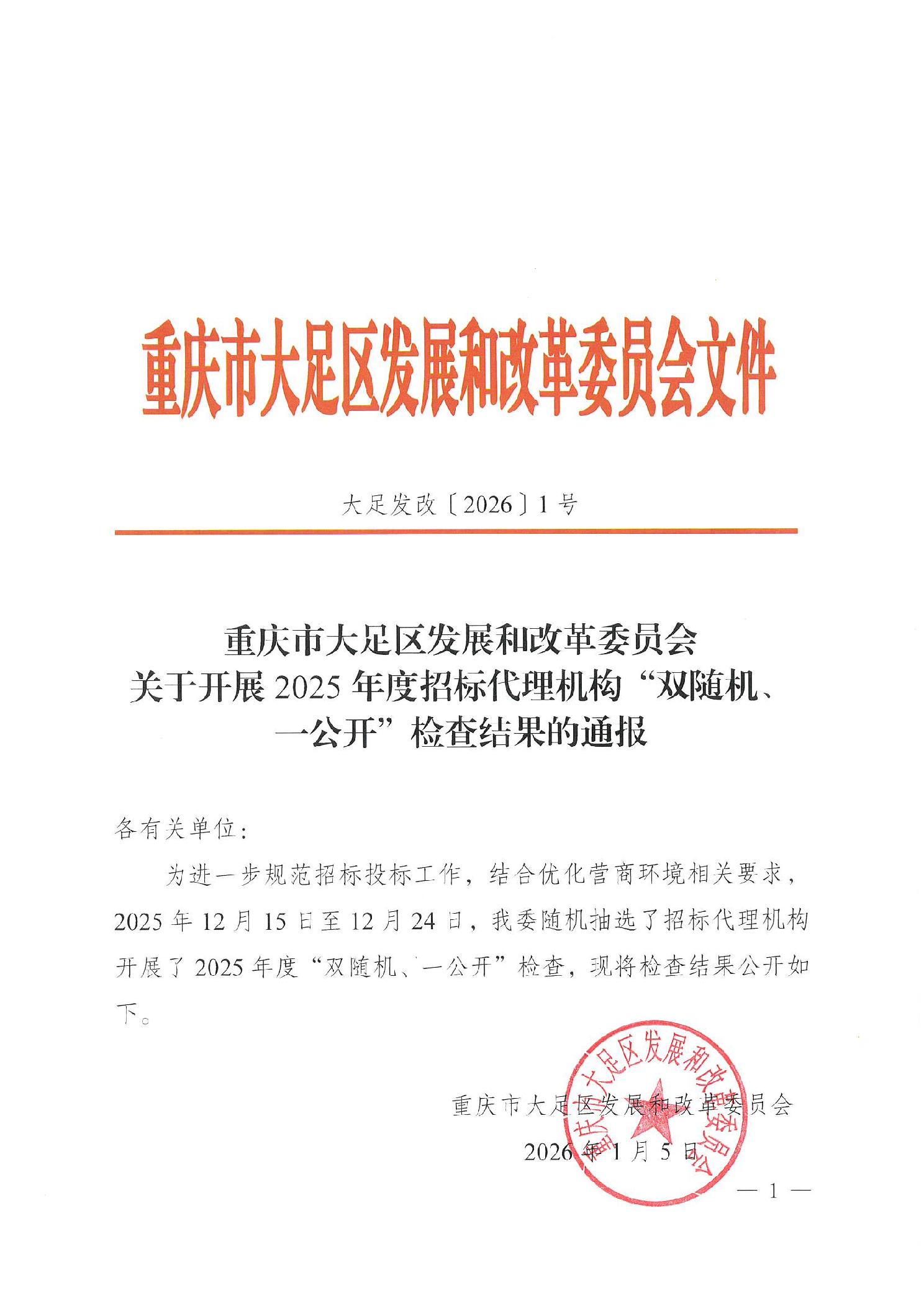 重庆市大足区发展和改革委员会 关于开展2025年度招标代理机构“双随机、一公开”检查结果的通报