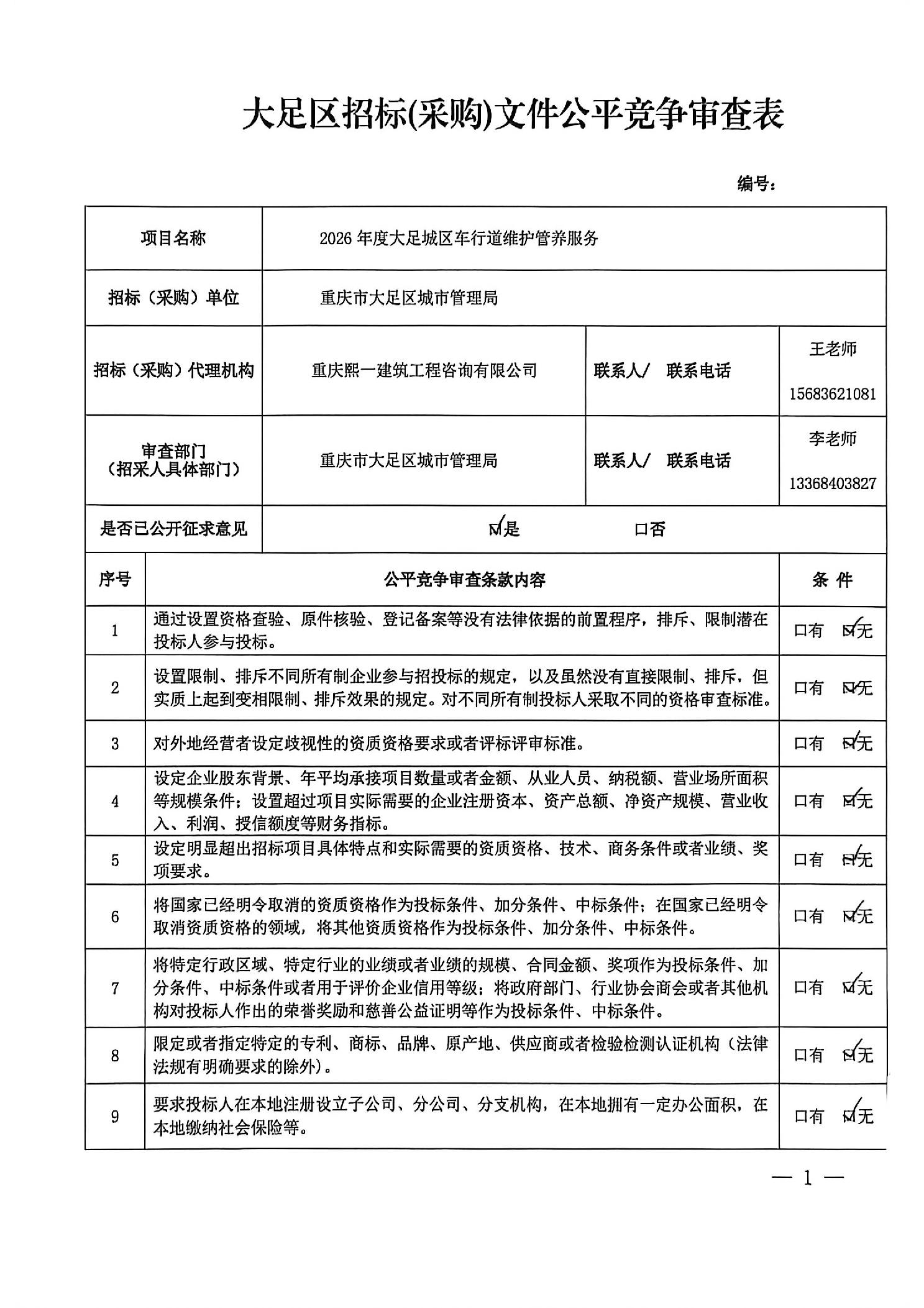 2026车行道大足区招标(采购)文件公平竞争审查表