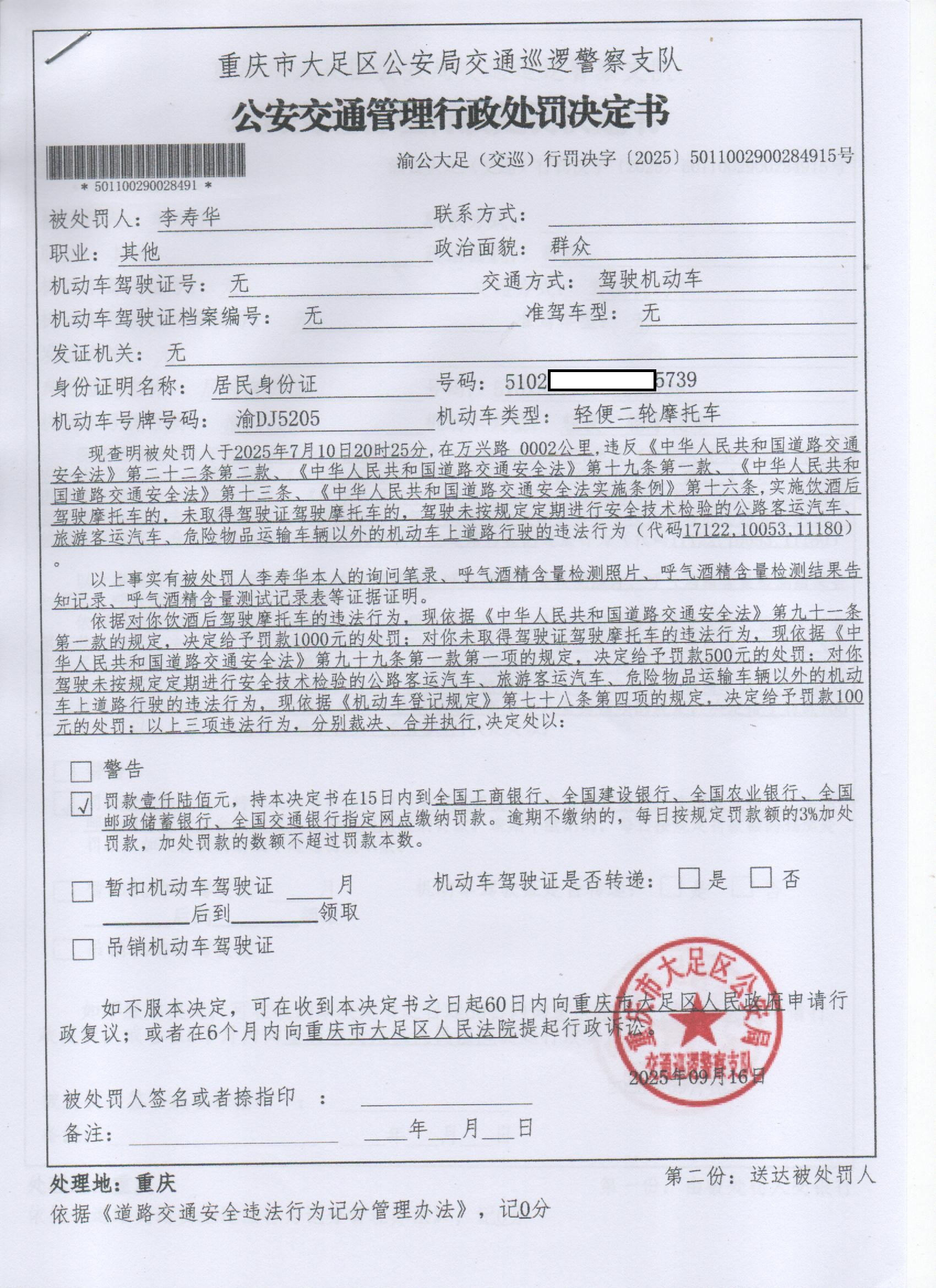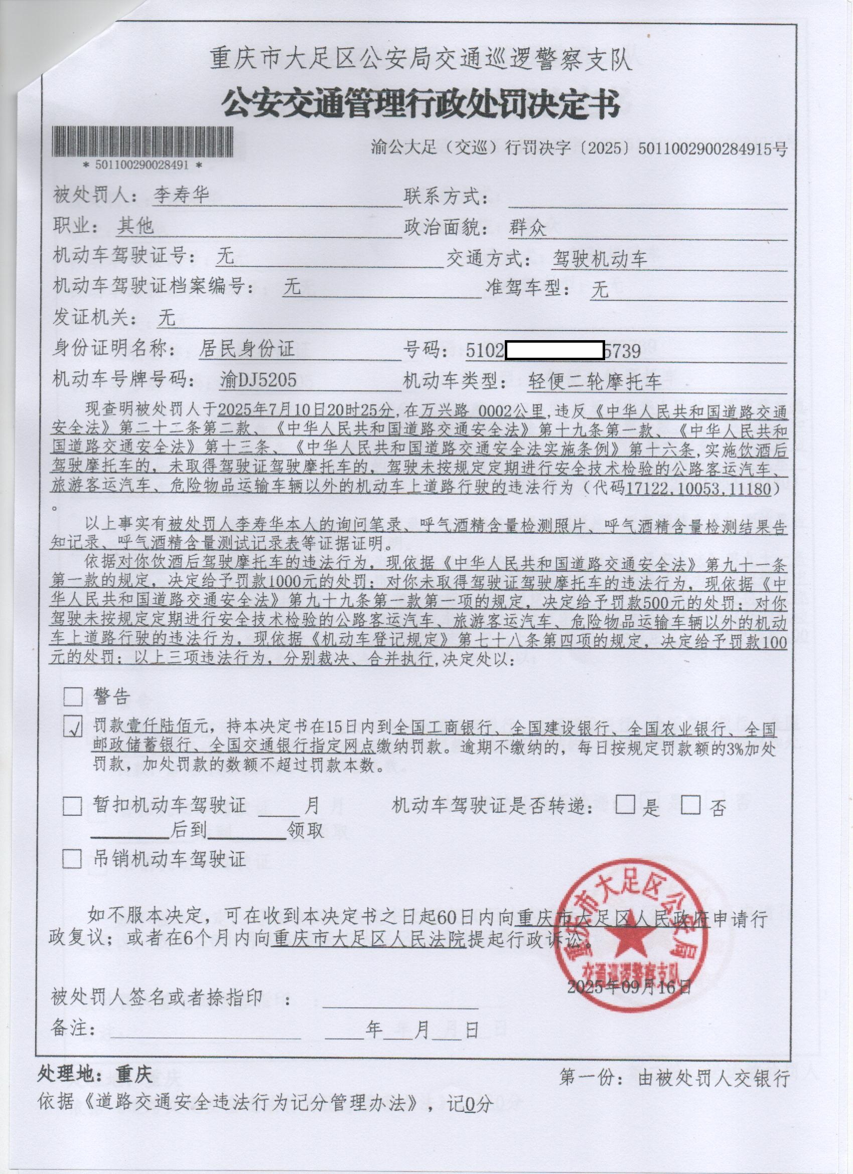 附件:《行政处罚决定书》(渝公大足(交巡)行罚决字【2025】第5011002900284915号)