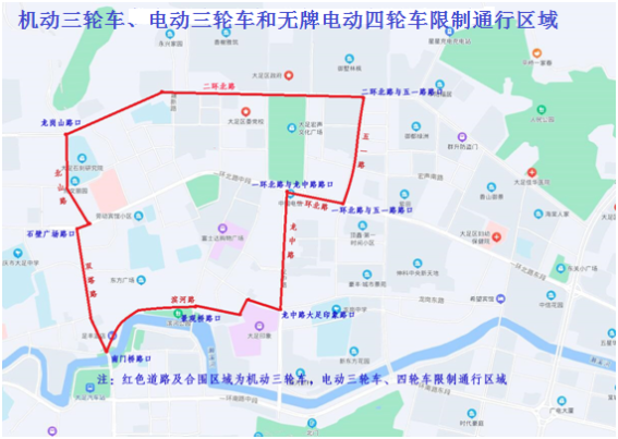 三轮车和无牌电动四轮车限行区域示意图
