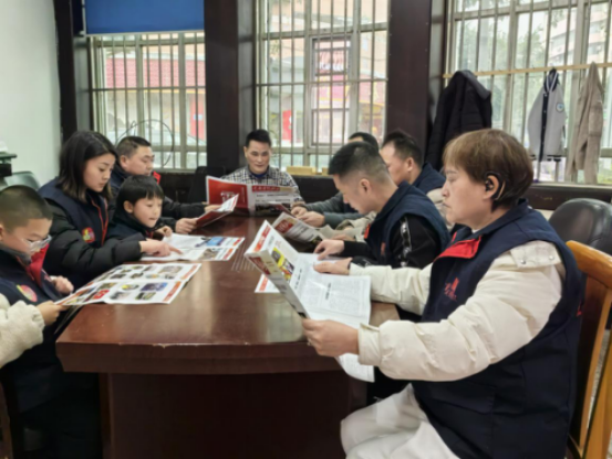 2月9日,大足区雷锋的士车队党支部书记蒋文友(中)组织驾驶员代表专题学习《重庆雷锋的士》期刊内容。唐园乔 摄影