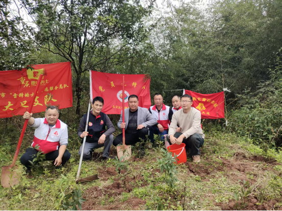 3月13日下午,大足雷锋的士车队队员在旗团村棺石水库旁的坡头植树后与李光彬(左三)合影。蒋文友 摄影