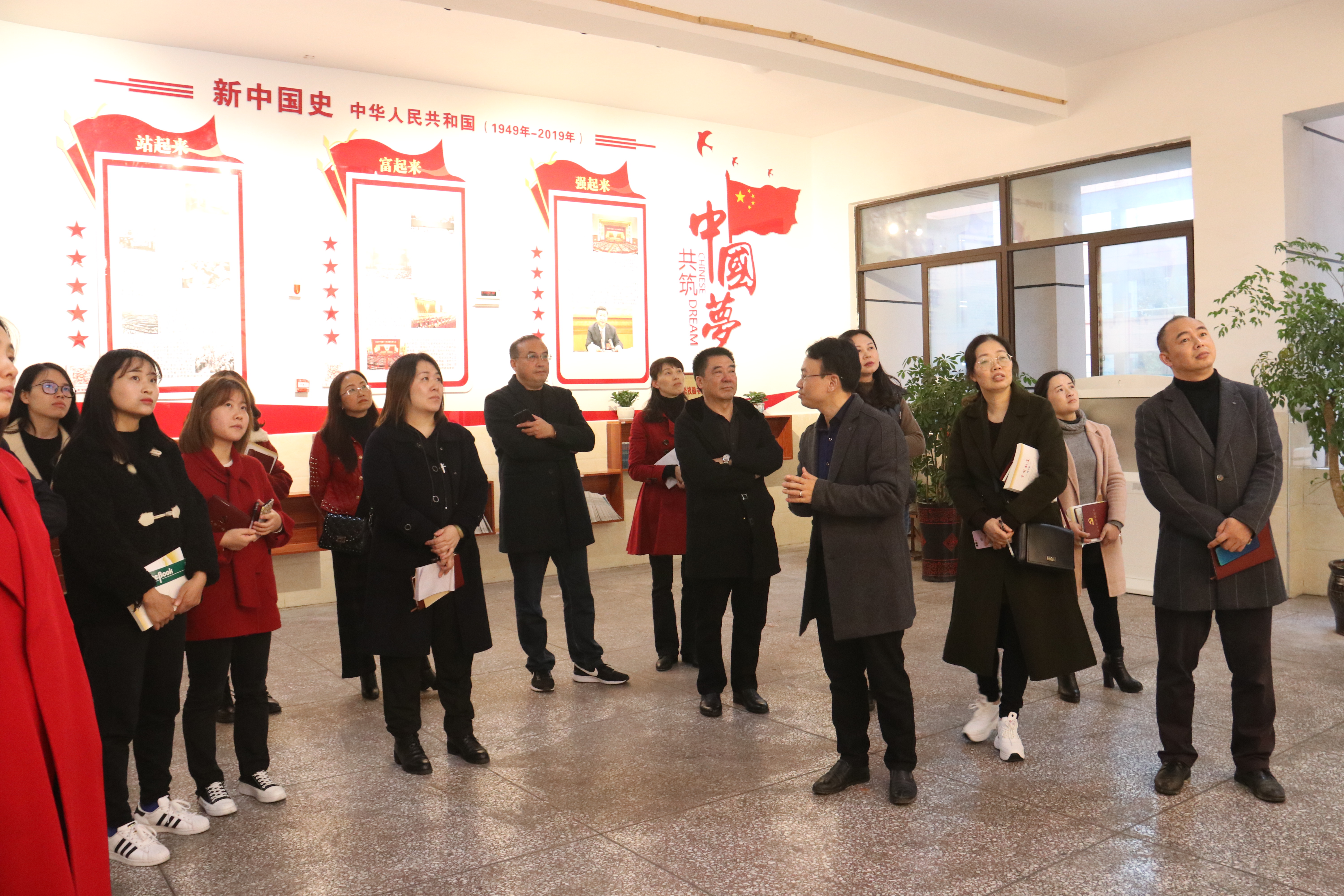 从爱国主义教育厅红色“时空隧道”的起点出发,大家一边听解说员讲解,一边沿“时间轴”长廊穿行,一边拿手机扫码观看红色影片,在边听边行边看中,完成了新奇有趣的红色“穿越”体验。时光随着移动的步伐回溯,红心伴着“穿越”的旅程而更加炽热。从南湖红船到杨家岭的“七大”,从天安门城楼“站起来”的巨响到十八大奏响“强起来”的乐章,从“定远”号邓世昌到饶国梁、钟南山……爱国教育厅里的一幅幅图片、一段段文字、一张张二维码,向大家展示了中国共产党的光辉历程、新中国取得的伟大成就,生动讲述了古往今来可歌可泣的爱国名人故事。学习结束后,党员们纷纷为学校新建的爱国主义教育厅点赞,给这次“不一样”的主题党日好评。