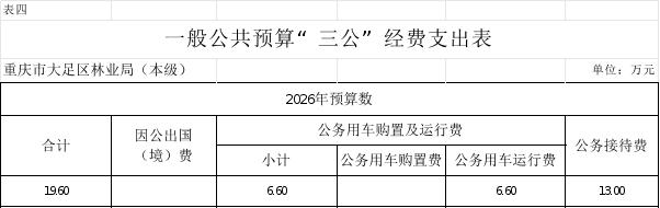 2026年“三公”经费预算19.6万元,比2025年减少0万元。其中:因公出国(境)费用0万元,比2025年减少0万元;公务接待费13万元,比2025年减少0万元,主要原因是厉行节约,严控公务接待;公务用车运行维护费6.6万元,比2025年减少0万元,主要原因是合理安排公务车使用;公务用车购置费0万元,比2025年减少0万元;主要原因是本年无购置公务用车预算。