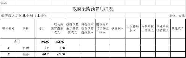 2.政府采购情况。所属各预算单位政府采购预算总额405万元:政府采购货物预算1万元、政府采购工程预算0万元、政府采购服务预算404万元;其中一般公共预算拨款政府采购405万元:政府采购货物预算1万元、政府采购工程预算0万元、政府采购服务预算404万元。
