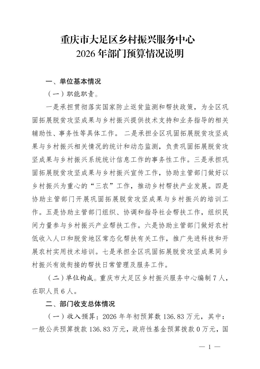 重庆市大足区乡村振兴服务中心2026年部门预算情况说明