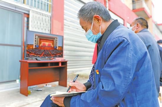 10月16日,大足区玉龙镇东兴村,村民边收看党的二十大直播盛况,边记笔记。