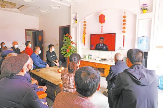 10月16日,棠香街道和平村,村民集中收看党的二十大直播盛况。