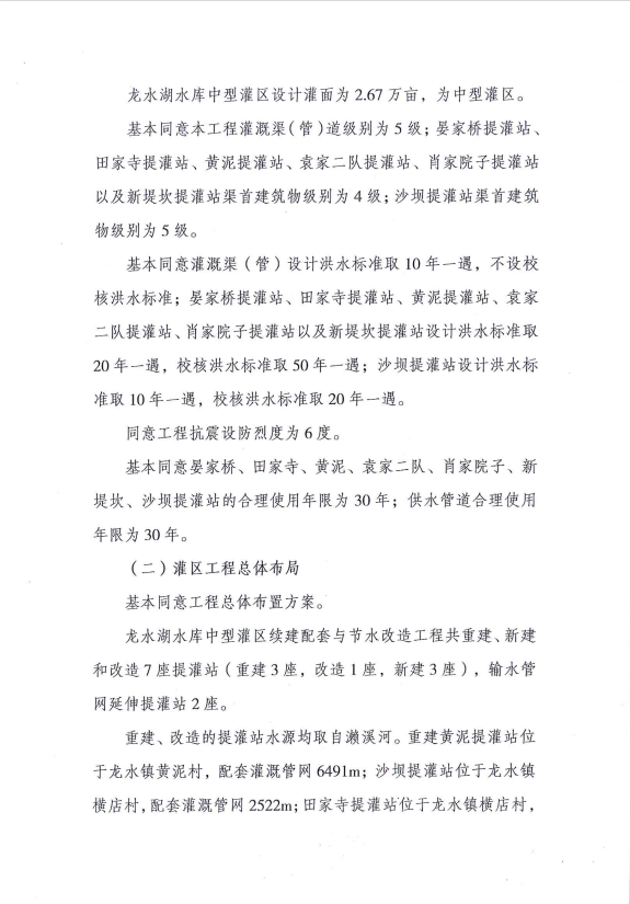 龙水湖水库中型灌区设计灌面2.67万亩,其中改善灌面1.51万亩,恢复灌面1.16万亩。本工程渠首建筑物共13座,其中改造(建)1座,新建3座,拆除重建3座,维持现状6座;输配水渠(管)线总长49190m。