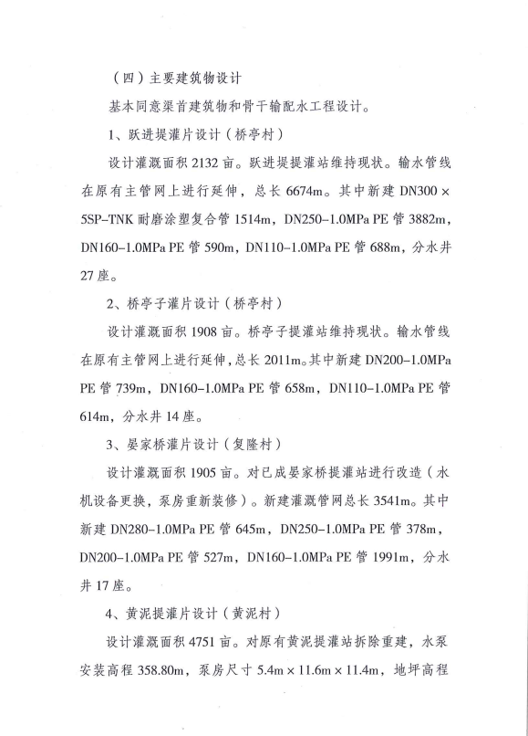 设计灌溉面积4751亩,本次设计对原有黄泥提灌站拆除重建,新建灌溉管网,合计管长6492m。包括:新建DN400*6SP-TNK耐磨涂塑复合管1117m、DN350*5SP-TNK耐磨涂塑复合管974m、DN250-1.0Mpa PE管4401m,新建分水井27座。