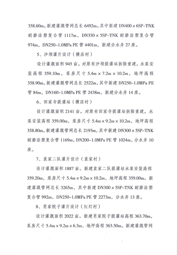 设计灌溉面积2022亩,本次设计新建肖家院子提灌站,新建灌溉管网,合计管长6252m。包括:新建DN300*5SP-TNK耐磨涂塑复合管904m、DN250-1.0Mpa PE管629m、DN200-1.0Mpa PE管1291m、DN160-1.0Mpa PE管3428m,新建分水井24座。