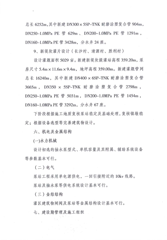 设计灌溉面积5029亩,本次设计新建新堤坎提灌站,新建灌溉管网,合计管长16240m。包括:新建DN400*6SP-TNK耐磨涂塑复合管3665m、DN350*5SP-TNK耐磨涂塑复合管2798m、DN250-1.0Mpa PE管5031m、DN200-1.0Mpa PE管1454m、DN160-1.0Mpa PE管3292m,新建分水井67座。