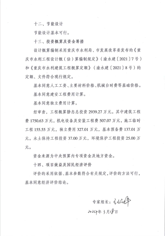 重庆市大足区龙水湖水库中型灌区续建配套与节水改造项目工程部分概算静态总投资2939.27万元。其中:建筑工程1750.63万元;机电设备及安装工程507.07万元;施工临时工程155.55万元;独立费用327.01万元;基本预备费137.01万元。水土保持工程费用37万元,环境保护工程费用25万元。