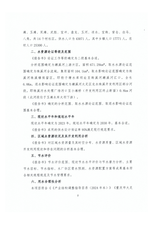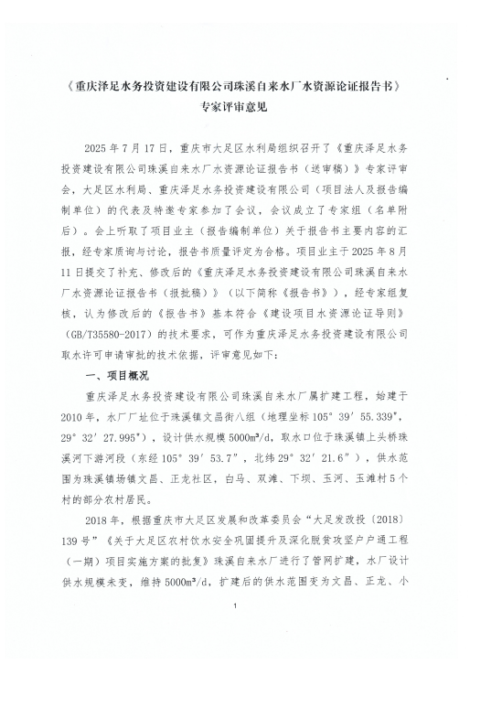 附件:重庆泽足水务投资建设有限公司珠溪自来水厂水资源论证报告书专家评审意见