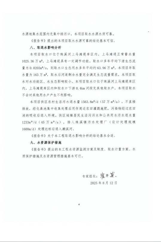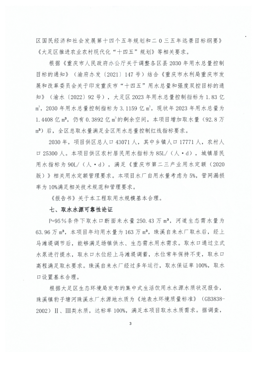 根据《报告书》,取水口珠溪河(豹子塘河)正常蓄水量1025.36万m3,经论证分析,珠溪河可满足本工程163万m3取水水量的要求;取水点现状水质为Ⅲ类,满足本工程取水水质的需求。