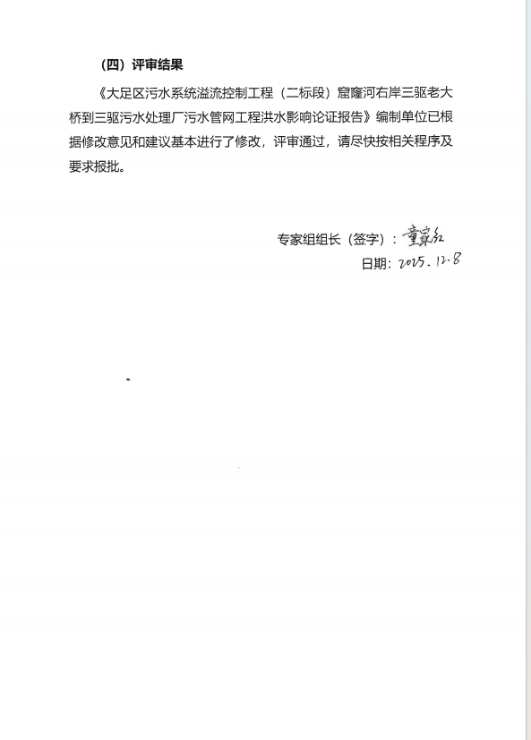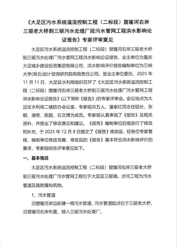 附件:1.大足区污水系统溢流控制工程(二标段)窟窿河右岸三驱老大桥到三驱污水处理厂段污水管网工程洪水影响评价报告专家评审意见