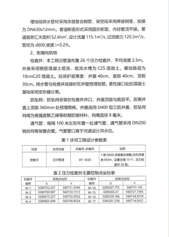 埋地段排水管材采用涂塑复合钢管,架空段采用焊接钢管,规模为DN630x12mm。管道断面形式采用圆形断面,内径管顶平接。管道服务汇水面积52.6hm2,设计流量115.1m3/s,过流能力120.3m3/s,管径为d600,坡度i=0.2%。
