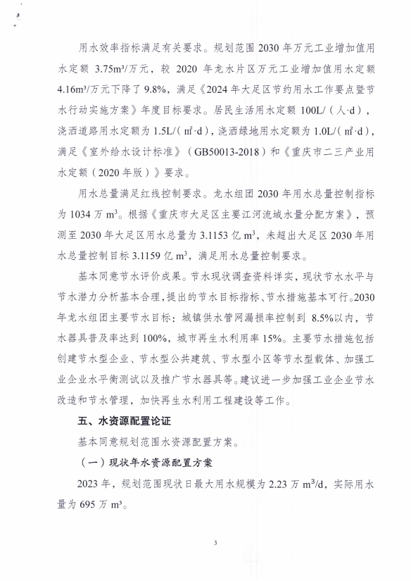基本同意《报告》主要内容。规划水平年为2030年;2030年工业园区需水量1034万m³,小于大足区2030年用水总量控制指标31159万m³,小于大足区濑溪河上游片区水资源五级区用水总量控制指标8635万m³,基本符合用水总量指标管控要求;2030年万元工业增加值用水量控制在3.75m³/万元,城镇供水管网漏损率控制在8.5%以内,基本符合节水目标管控要求;2030年工业园区供水水厂为双路镇水厂,水源为玉滩水库、十里沟水库以及渝西水资源配置工程,其中玉滩水库供水716万m3,十里沟水库供水38万m3,渝西水资源配置工程供水210万m3,再生水供应70万m3。水资源配置方案基本合理。