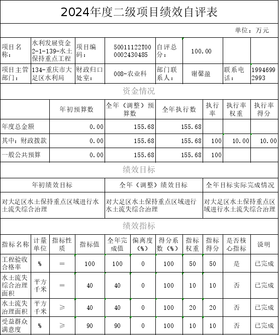 1.对水利发展资金-水土保持重点工程开展了绩效评价,涉及财政拨款项目资金155.68万元,评价得分100分,评价等次为优,绩效评价未发现问题,提出“再接再厉,努力做得更好”等下一步工作建议。