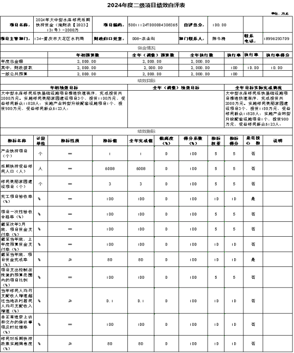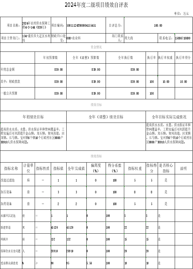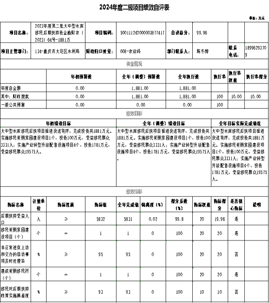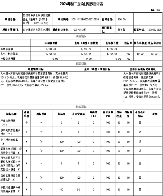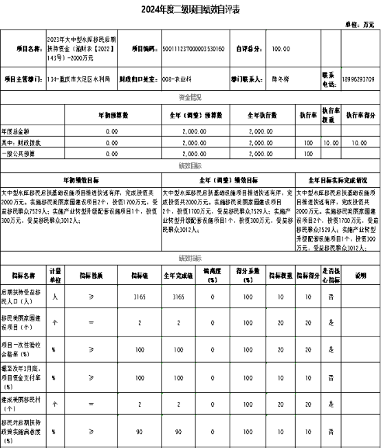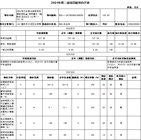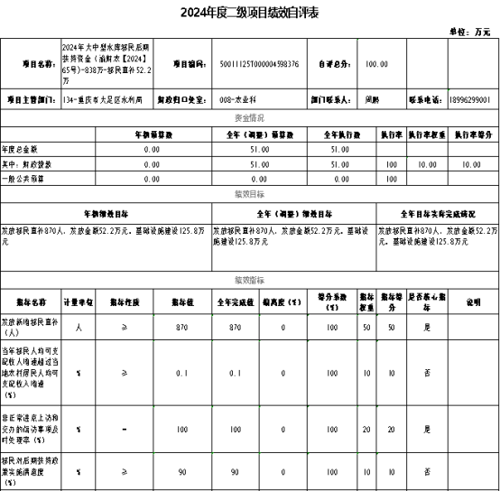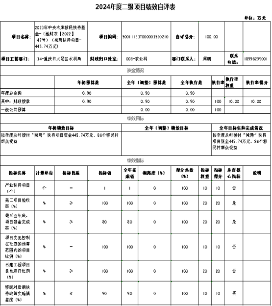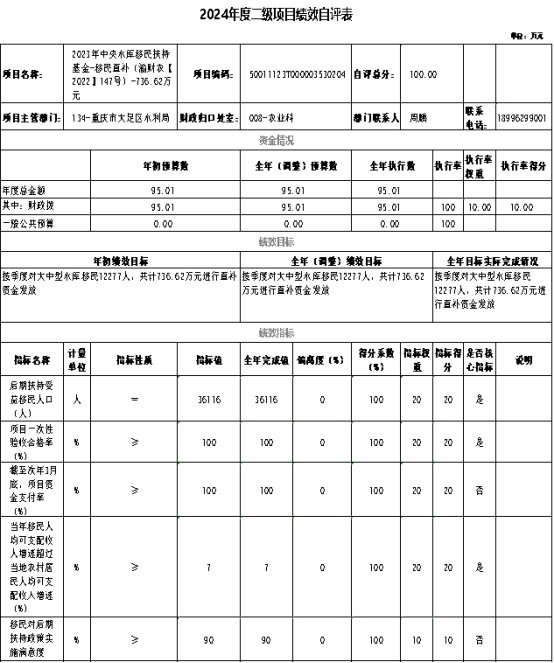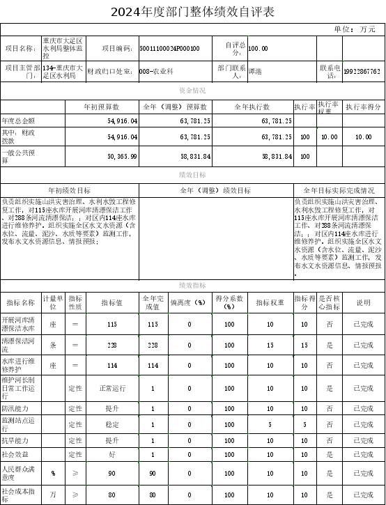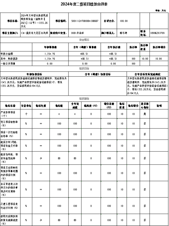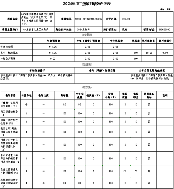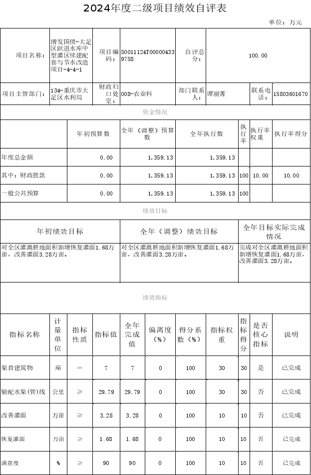 - 对大足区跃进水库中型灌区续建配套与节水改造项目开展了绩效评价,涉及财政拨款项目资金95.11万元,评价得分100分,评价等次为优。