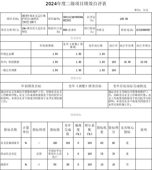 - 对2023年度水文运行维护项目开展了绩效评价,涉及财政拨款项目资金0.13