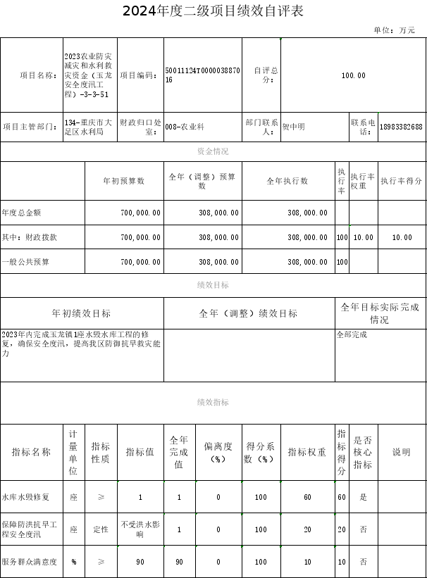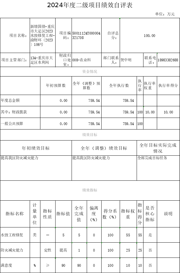 - 对增发国债-大足区小型水库安全监测设施项目开展了绩效评价,涉及财政拨款项目资金511.74万元,评价得分100分,评价等次为优。