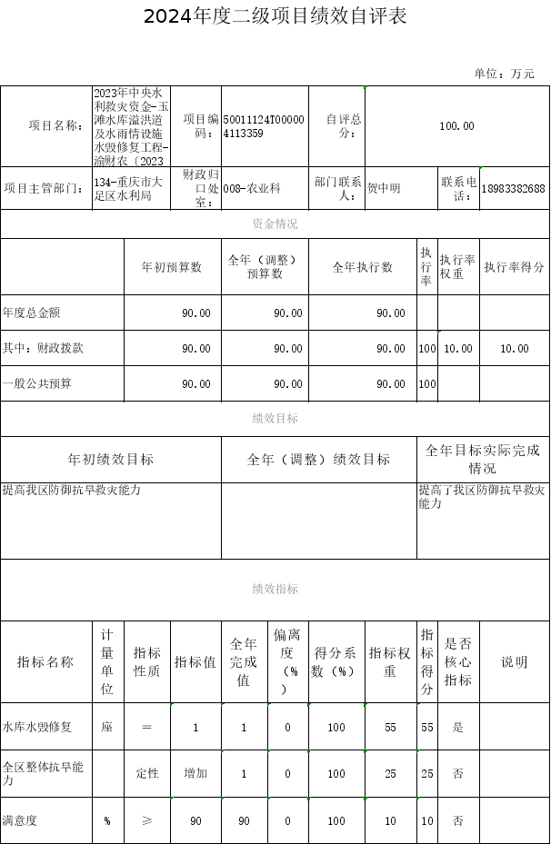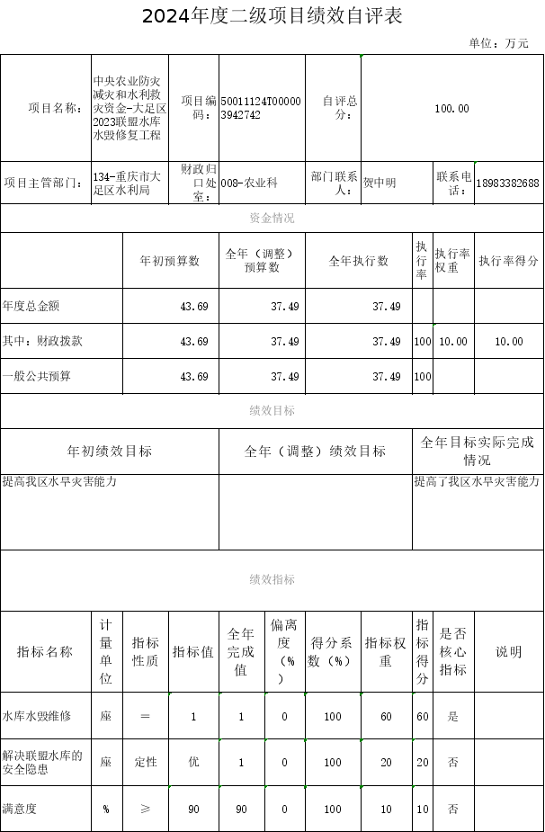 29. 对大足区2023联盟水库水毁修复工程开展了绩效评价,涉及财政拨款项目资金37.49万元,评价得分100分,评价等次为优。