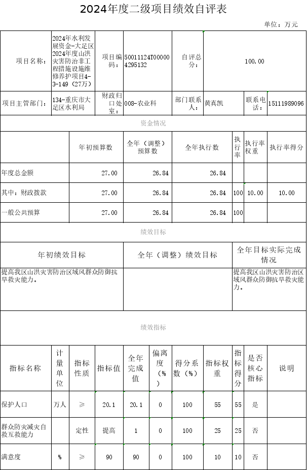 28. 对大足区2024年度山洪灾害防治非工程措施设施维修养护项目开展了绩效评价,涉及财政拨款项目资金26.84万元,评价得分100分,评价等次为优。