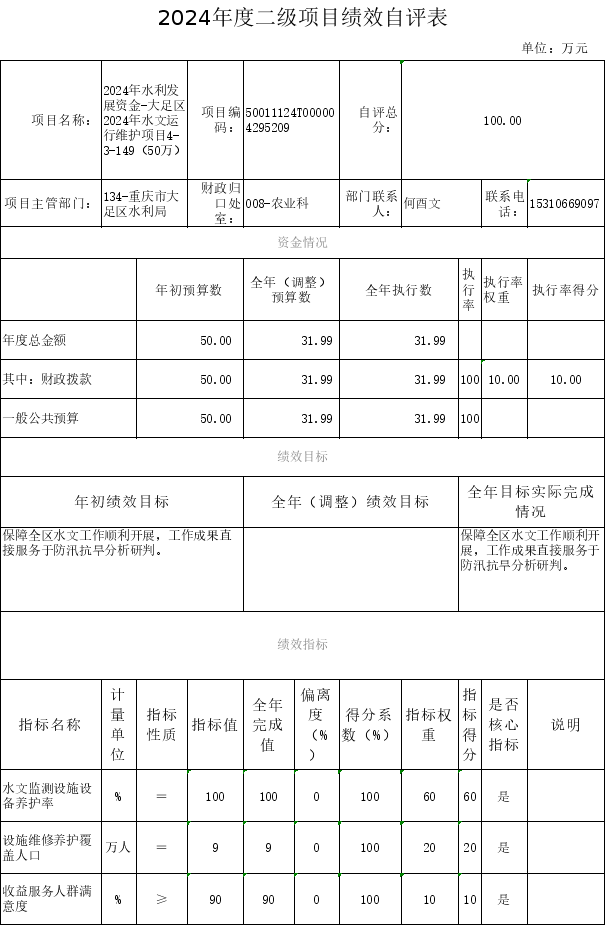 26. 对大足区2024年水文运行维护项目开展了绩效评价,涉及财政拨款项目资金31.99万元,评价得分100分,评价等次为优。