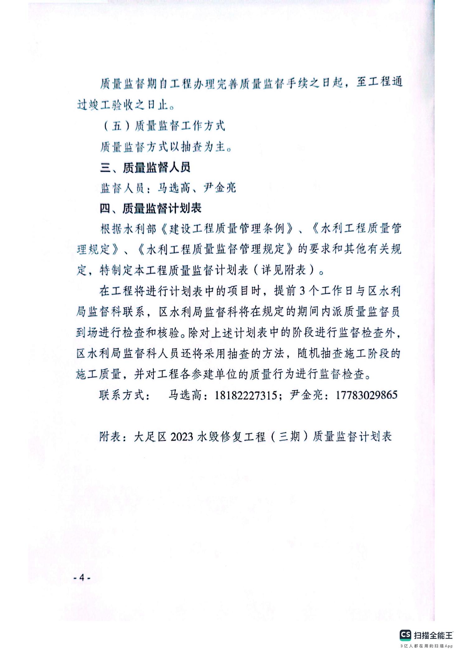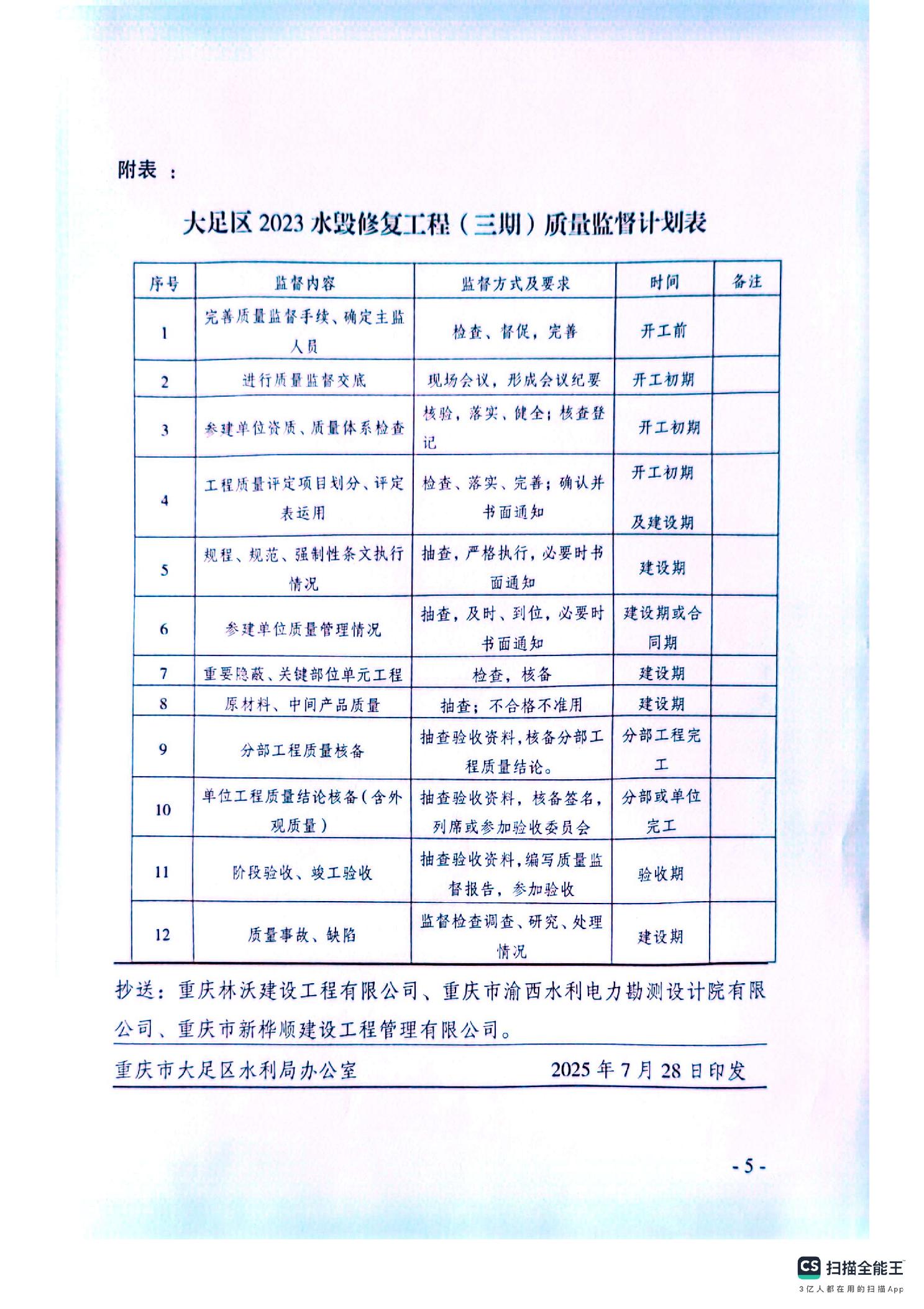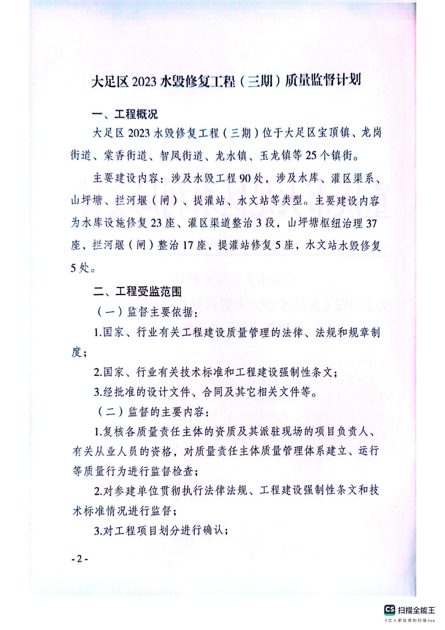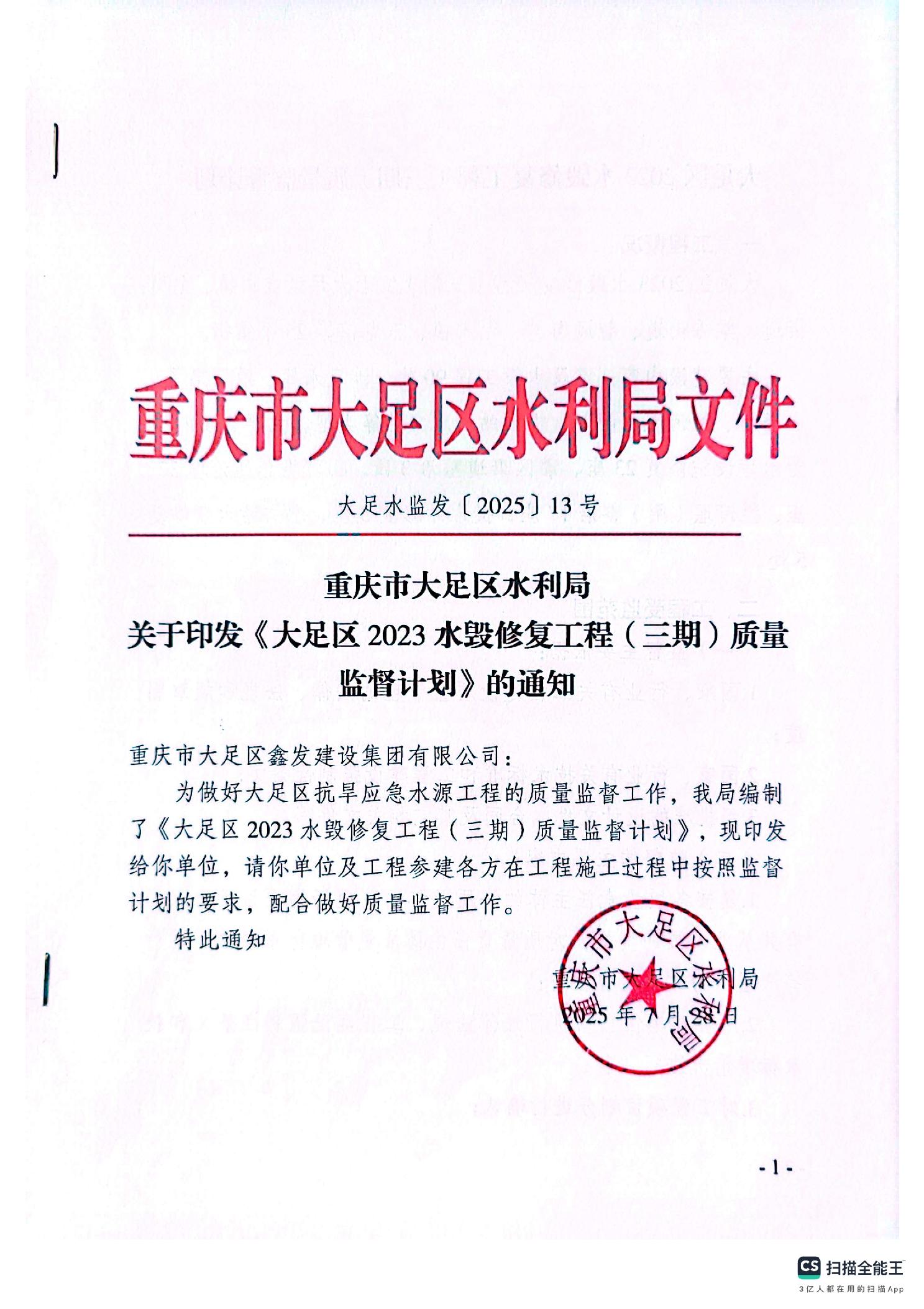 大足水利监发〔2025〕13号关于印发《大足区2023水毁修复工程(三期)质量监督计划》的通知