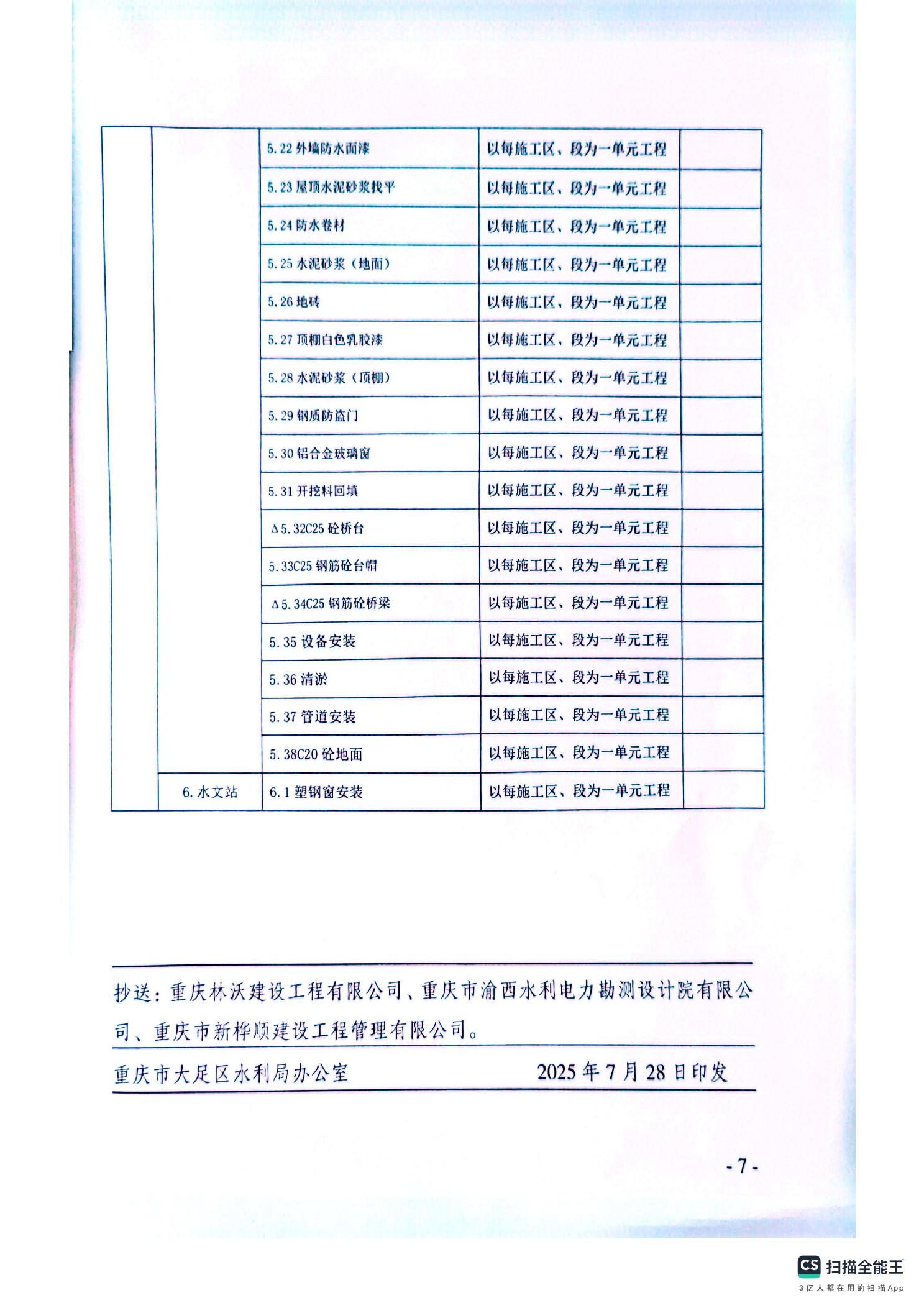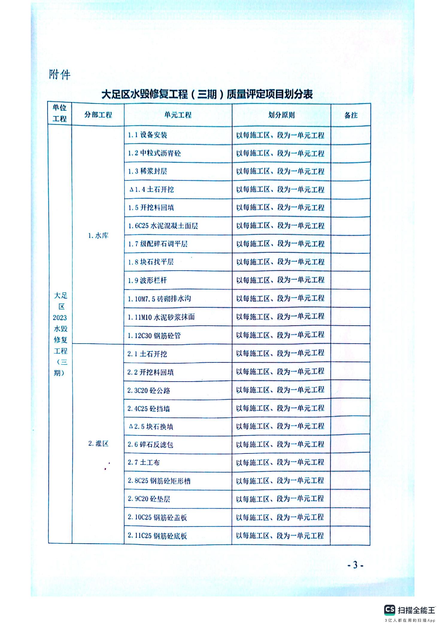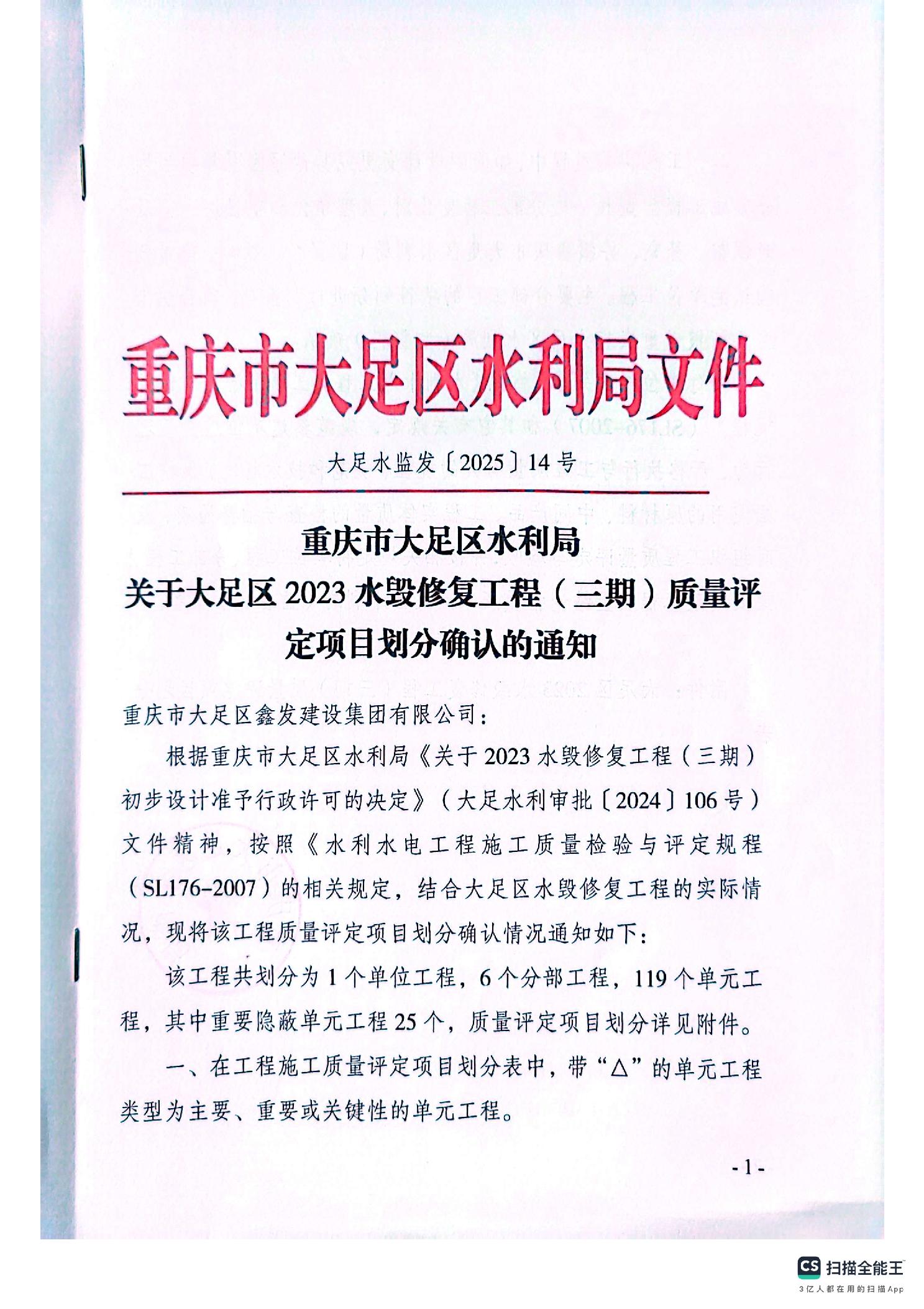 大足水利监发〔2025〕14号关于大足区2023年水毁修复工程(三期)质量评定项目划分确定的通知