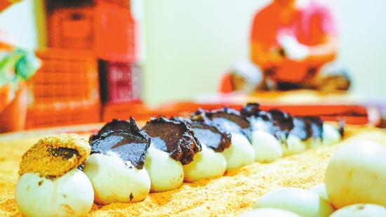 在尊香园的生产线上,一枚皮蛋要经历收蛋、分级、配料、裹泥、装坛、开坛、晾晒、复选、打包等十余道工序。其中,“洞藏”是黄汉涛的独门技艺。