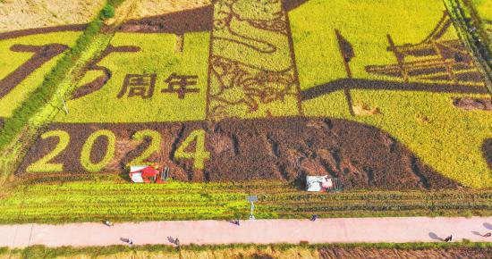 “在重庆,我们一年只能种一季水稻,要么中稻,要么晚稻。一般农户大多种中稻,在8月进行收割。但五彩田园也种中稻的话,受炎热天气影响,来观赏的人就不多了,所以我们选择对技术要求更高的晚稻,为的就是抢抓‘十一黄金周’。”据大足区拾万镇副镇长王地生介绍,这300余亩稻田全部种植的是一种名为“彩叶稻”的晚稻,该品种在保障产粮基础上还极具观赏性,是隆平五彩田园“稻田画”的“颜料”。记者在现场看到,田野里的“彩叶稻”共有黄、绿、白、紫、红五种颜色,它们共同绘就《农业强国和美乡村》这幅栩栩如生的稻田画。