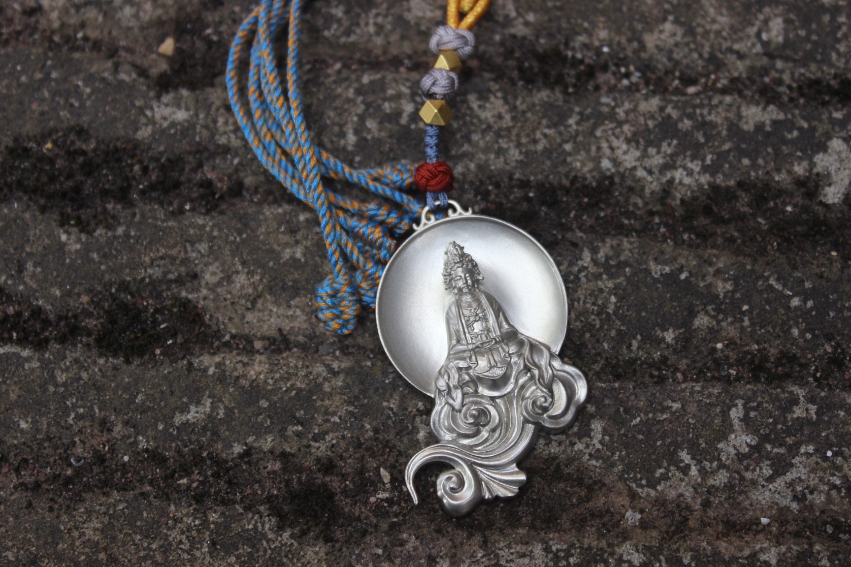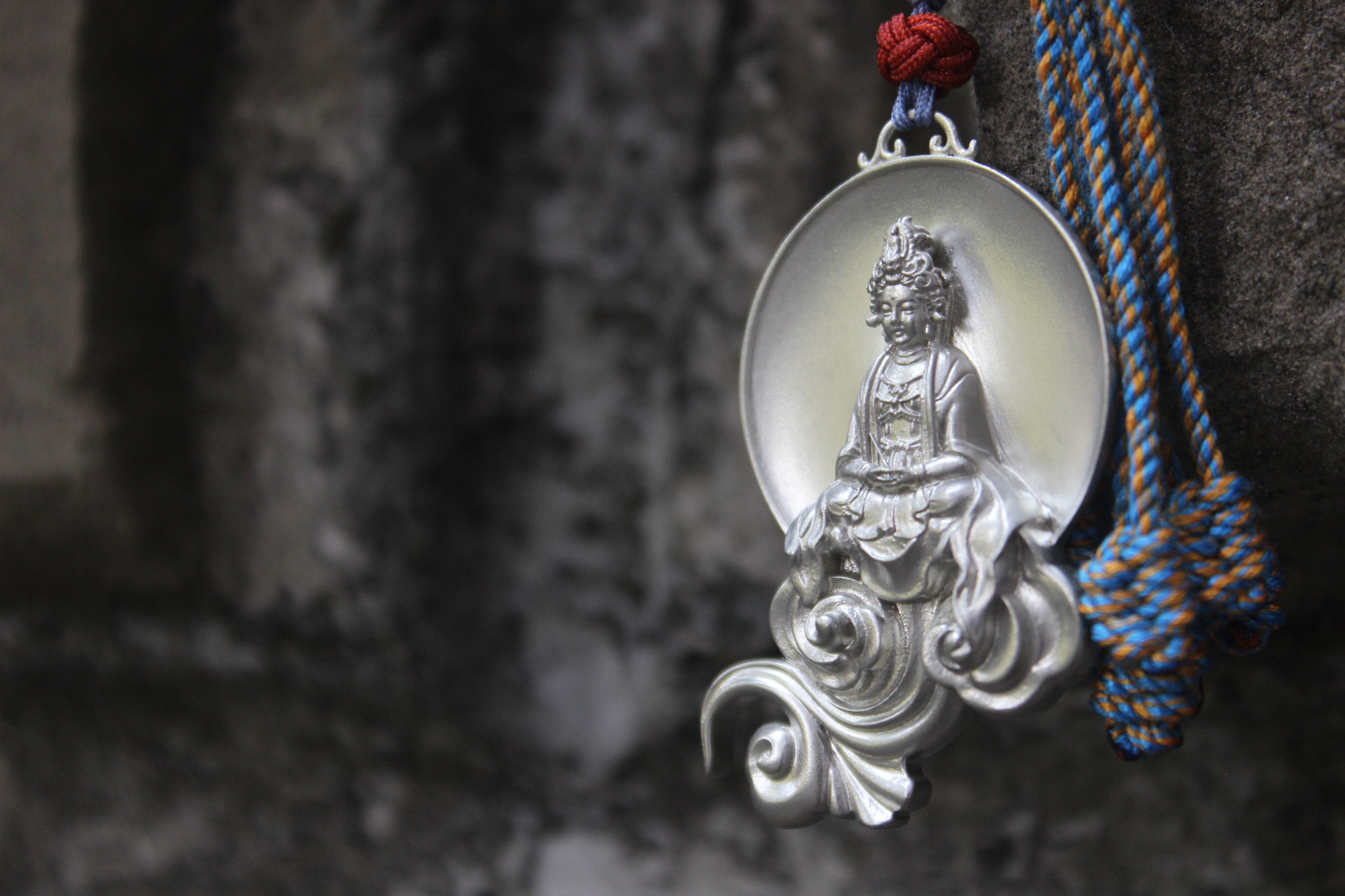 设计源于大足宝顶山石刻-马首明王,截取头侧毫光中所作的观音菩萨。十大明王是佛和菩萨为护持柳本尊行化正法而显现的降魔化身像。众多明王中,除孔雀明王着慈悲像外,其余皆着愤怒像。马首明王虽怒目咧口,然毫光中所坐菩萨慈悲祥和,故以此为型。欲以明王护持之力,寓意明王护佑,安康吉祥。
