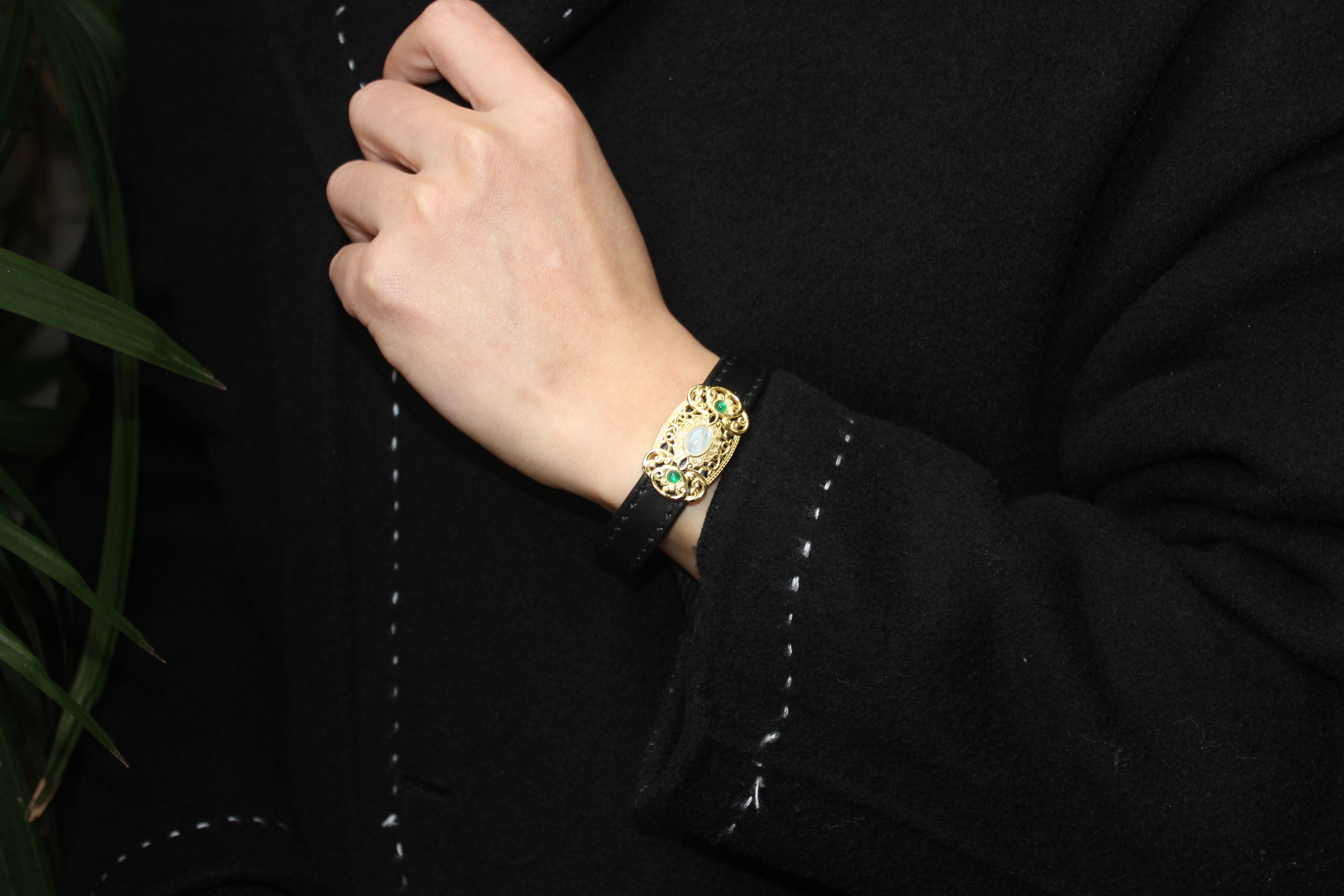设计源于大足北山石刻数珠观音,截取观音头部宝冠元素。《华严经》中对菩萨所戴宝冠做了解释,认为头冠代表了菩萨本身、智慧、光明等,头冠不仅是菩萨的配饰,更是人民心中对菩萨的寄托和祈求。