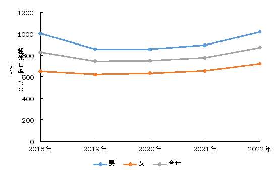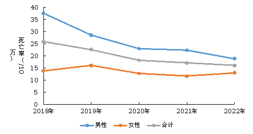 2022年慢性病及其危险因素监测显示15岁及以上人群吸烟率为22.94%,较2018年慢性病及其危险因素调查结果18岁以上人群吸烟率26.17%下降12.34%,男性(48.00%)远远高于女性(0.32%)。