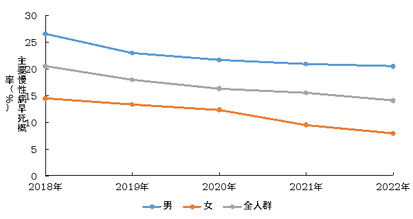 3.1 主要慢性病早死概率:从2018的20.40%降低至2022年的13.97%,下降幅度31.52%。