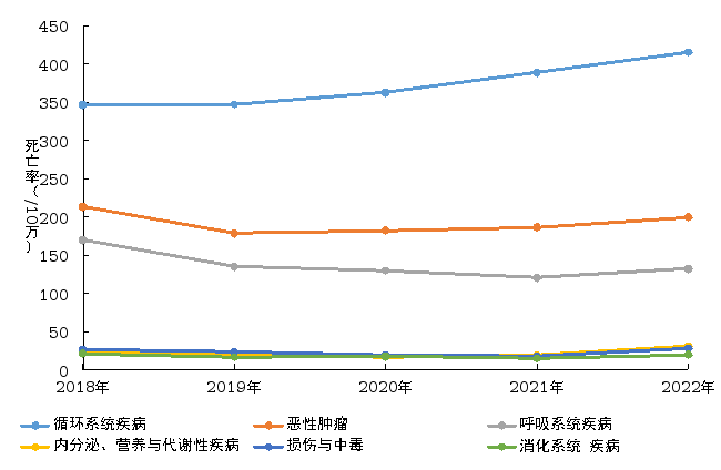 2018~2022年,循环系统疾病、恶性肿瘤、呼吸系统疾病、神经系统疾病、损伤和中毒始终占据大足区主要死因顺位前五位,慢性非传染性疾病历年均占全死因的90%以上,恶性肿瘤和心脏病的死亡率总体呈上升趋势。
