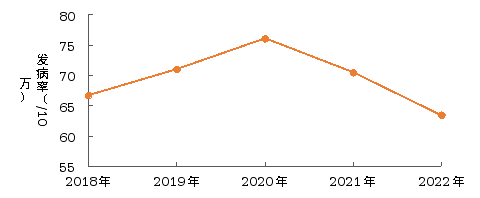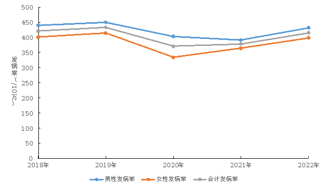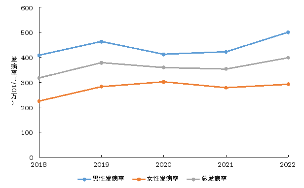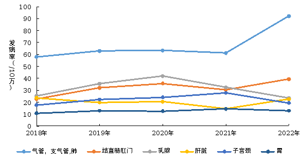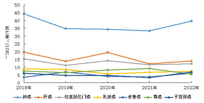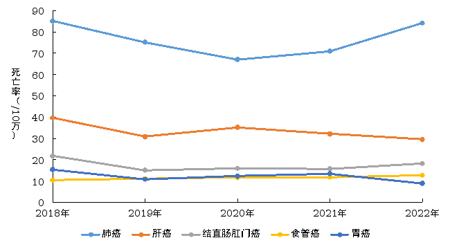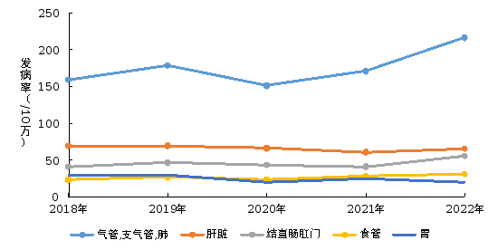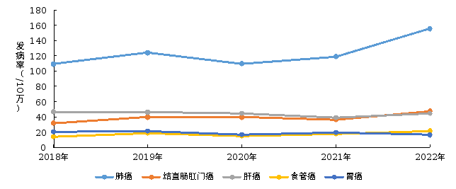 2022年恶性肿瘤报告粗发病率为397.52/10万,报告粗死亡率为199.00/10万,肺癌是最常见的癌症,占全部新发癌症病例的38.98%。2018~2022年大足区区恶性肿瘤发病率处于波动上升状态,历年发病率排列前五位的癌种有肺癌、结直肠肛门癌、肝癌、食管癌、胃癌。