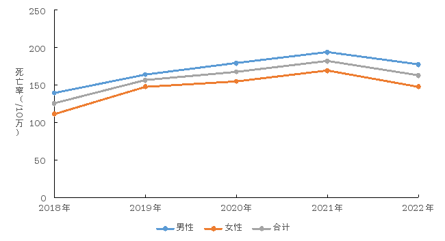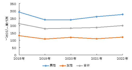 居民死亡资料数据2021年前来源于中国疾病预防控制系统——死因登记报告信息系统,2022年死因来源于重庆市智慧健康云平台——重庆市慢性病监测管理系统(死因登记模块),死因监测资料采用疾病分类,按国际标准ICD-10编码处理,资料由各级医疗机构填写《死亡医学证明(推断)书》后录入中国疾病预防控制信息系统——死因登记报告信息系统和重庆市智慧健康云平台——重庆市慢性病监测管理系统(死因登记模块),再由区疾控中心审核。数据统计分析采用SPSS软件,主要指标有死亡率、死因顺位和期望寿命等。人口数据来源于中国疾病预防控制信息系统的常住人口数。