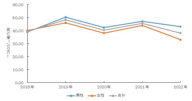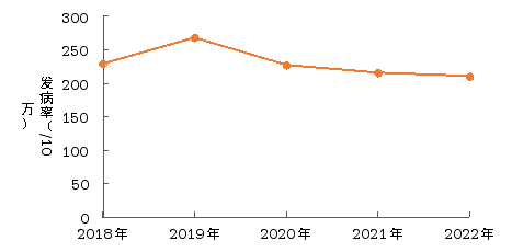 2022年报告常住人口脑卒中报告发病率为603.89/10万,死亡率为162.58/10万。2018~2022年脑卒中发病率呈缓慢下降趋势,死亡率呈波动小幅上升趋势。2022年报告常住人口心肌梗死发病率为22.61/10万,死亡率37.85/10万。2018~2022年心肌梗死发病率和死亡率均呈波动下降趋势。