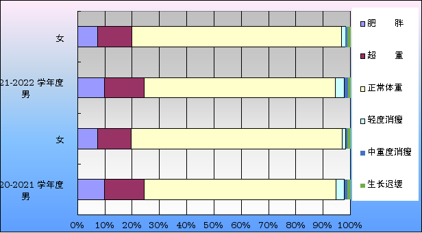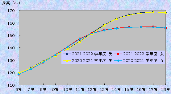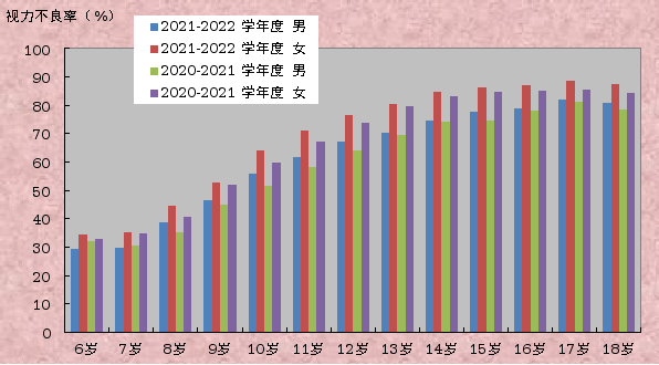 2022年全区6~18岁中小学生乳恒牙混合龋齿患病率为33.60%,男女生分别为32.33%、35.00%;视力不良检出率64.58%,其中男女生分别为60.77%、68.77%;超重检出率为13.70%,男女生分别为14.61%、12.06%;肥胖检出率为8.67%,男女生分别为9.90%、7.32%;营养不良检出率为4.40%,男女生分别为5.43%、3.27%。2018~2022年男女生视力不良检出率呈上升趋势,学生患龋率总体呈波动下降趋势,超重和肥胖总体呈上升趋势,营养不良检出率总体呈下降趋势。
