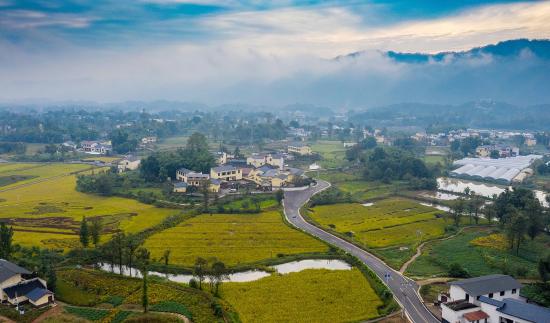 大足区拾万镇长虹村,金色的田园、蜿蜒的公路与错落有致的民房相映成趣,构成一幅美丽的乡村画卷。(拍摄于2023年10月11日)新渝报记者 黄舒 摄