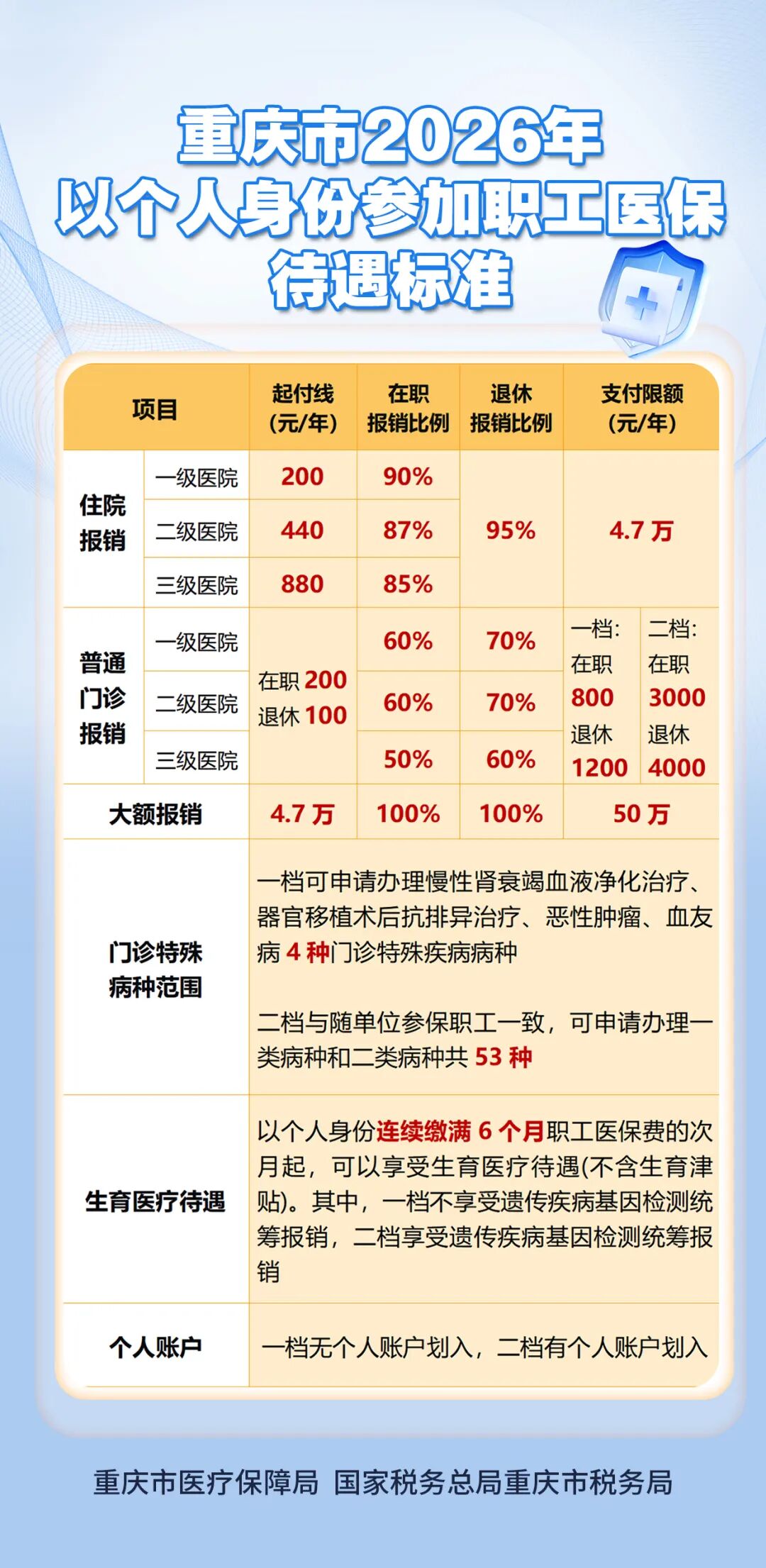 【一图看懂】重庆市2026年以个人身份参加职工医保待遇标准