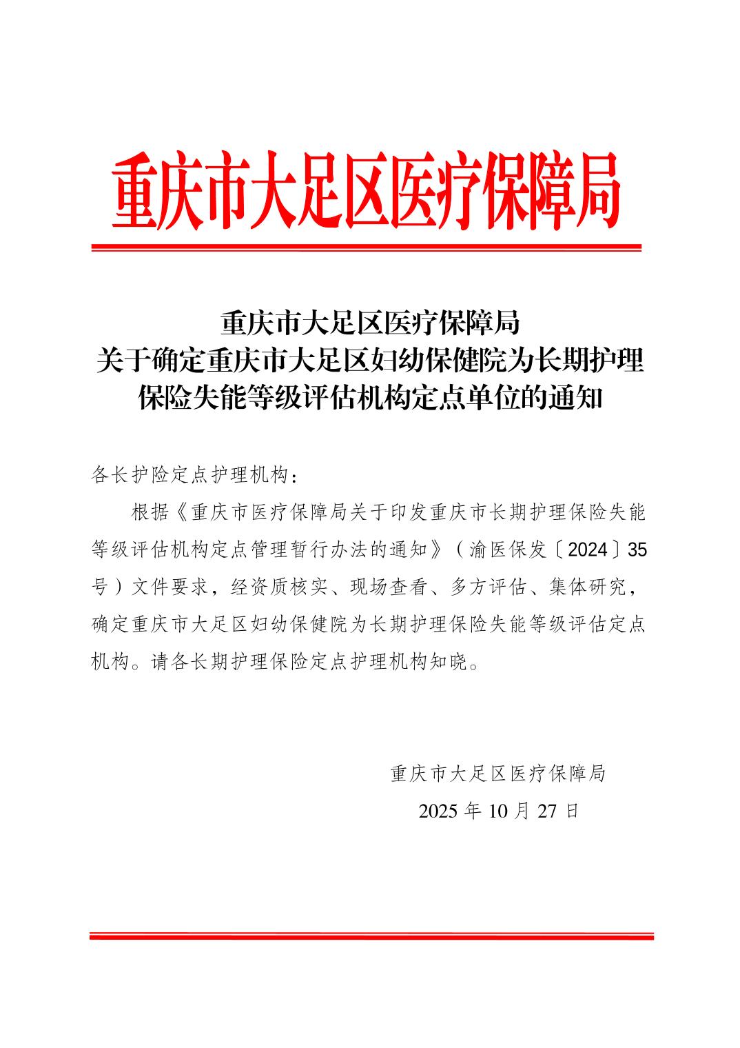 重庆市大足区医疗保障局关于确定重庆市大足区妇幼保健院为长期护理保险失能等级评估机构定点单位的通知