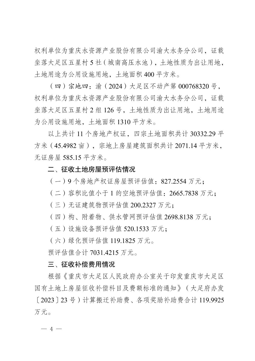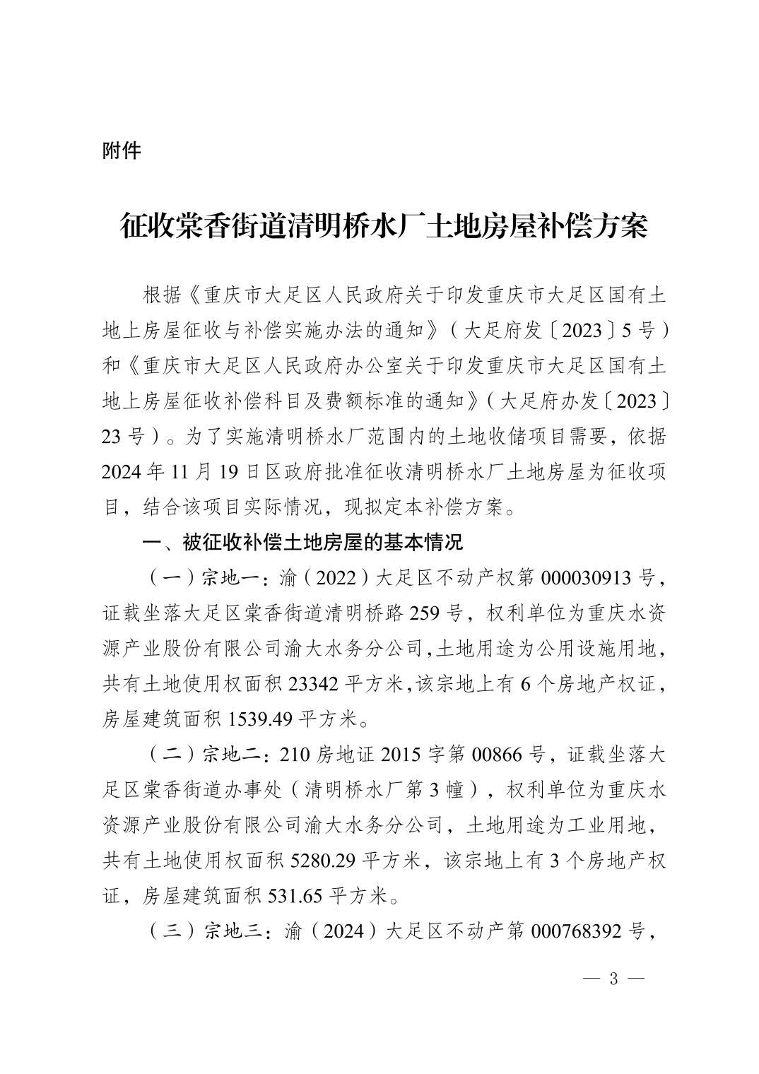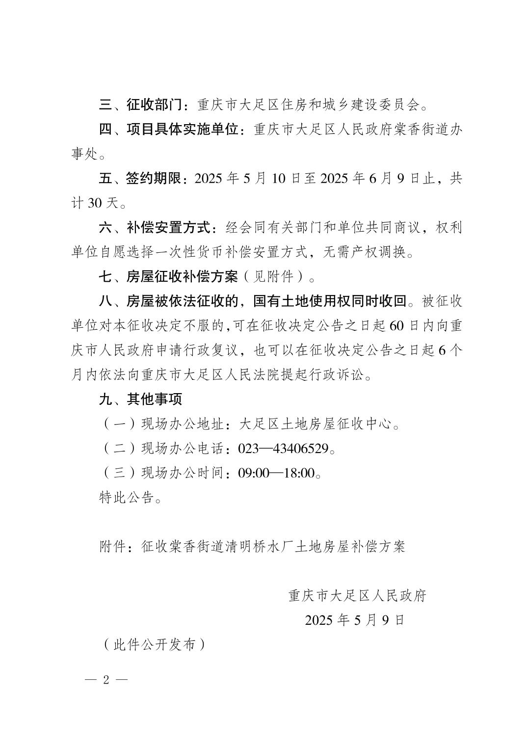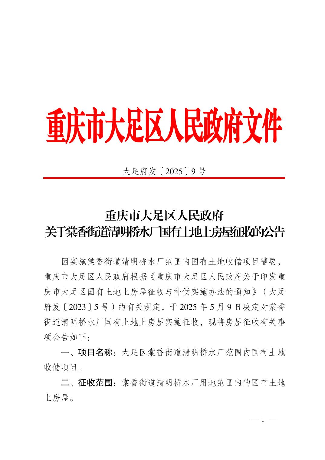 大足府发〔2025〕9号《关于棠香街道清明桥水厂国有土地上房屋征收的公告》