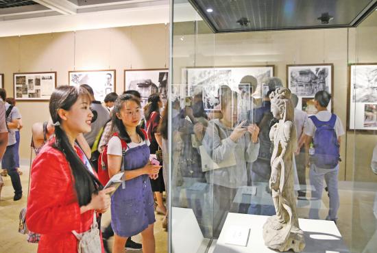 重庆三峡博物馆内,众多市民在观看《回望百年——大足石刻历史影像展》。