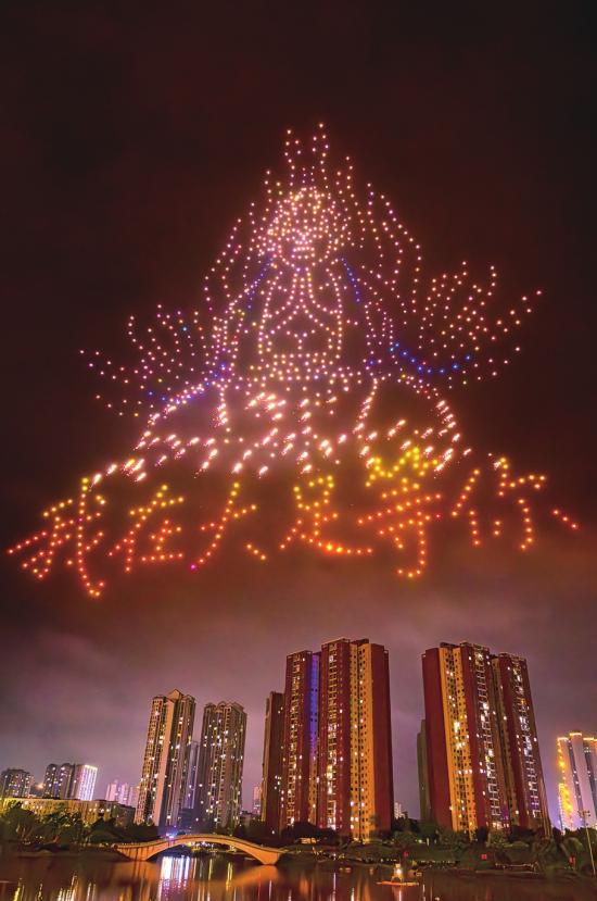 10月1日晚,大足区香国公园妙善湖上空化作一幅流动的星河画卷——作为《一念·大足》昌州夜宴国庆中秋主题活动的重头戏,无人机编队以苍穹为卷,为全区群众和游客开启了一场穿越千年的对话,生动诠释了世界文化遗产的深厚底蕴。夜幕降临,无人机群如灵动的画师,在夜空中勾勒出世界文化遗产大足石刻的壮丽图景。巨型佛像在光影变幻中渐次舒展,细腻线条与柔和光晕交织,瞬间将观众带入千年石刻的庄严与神秘。随后佛像幻化为“大足印”图腾,寓意“千里之行,始于足下”,恰与国庆佳节的热烈氛围交相辉映。表演高潮迭起,无人机群化身宝顶山卧佛,31.6米长的卧佛横亘天际,气势恢宏;转而化作龙水湖蜿蜒的湖岸线,山水相依的灵秀在烟花中跃然眼前。更令人惊叹的是,一条巨龙盘旋攀升,拱卫起流光溢彩的“天空之门”,冷烟花如星雨倾泻,将中华文明的图腾与现代科技完美融合。