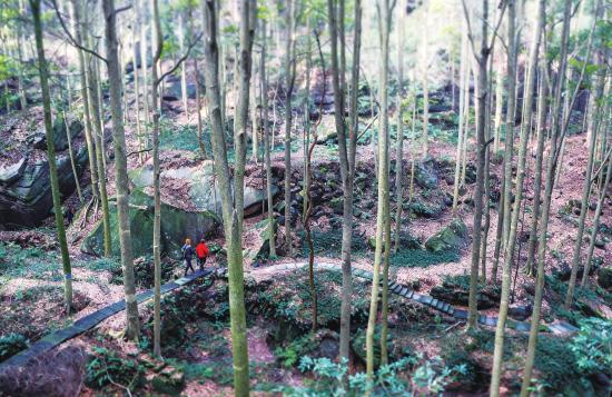 11月11日,大足区高坪镇巴蜀雅楠景区内,游客沿着蜿蜒的石板小径漫步于茂密的金丝楠木林间,感受这片百年林海特有的静谧与清幽。