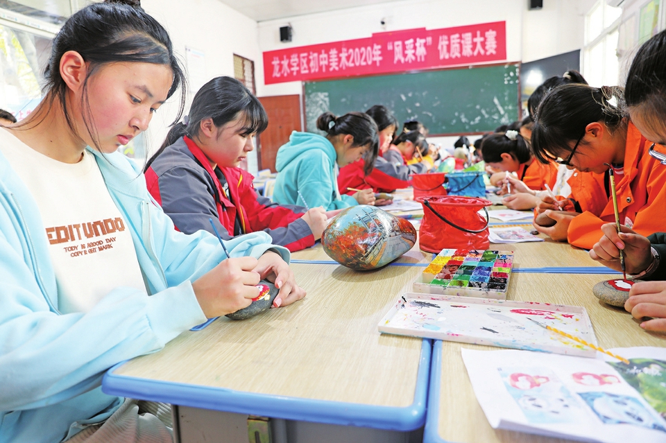 初二学生廖钧说,将来自己不一定会选择绘画,但毛老师教会他们的鹅卵石彩绘画,他永远也忘不了。本报记者陈龙曹栋文/图